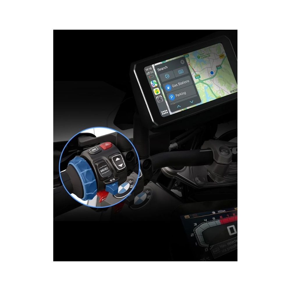 Телефонът е в безопасност в джоба, на зарядното в танкбаг или в куфара, а неговият дисплей просто се отразява на устройството Chigee AIO-5 Play за BMW. Неговият 5" сензорен екран реагира перфектно на команди с ръкавици, е устойчив на удари, прах и вода. След като бъде поставен в оригиналното приготвяне на навигацията, Chigee AIO-5 се включва и изключва с запалването на мотора.