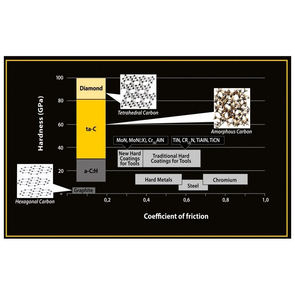 Die Beschichtung Tetrahedral Amorphous Carbon (ta-C) ist eine fortschrittliche DLC-(Diamond-Like-Carbon)-Beschichtung, die auf die Oberflächen der Hülsen und Rollen der HPE-Kette aufgebracht wird und hohe Härte mit niedrigem Reibungskoeffizienten verbindet.