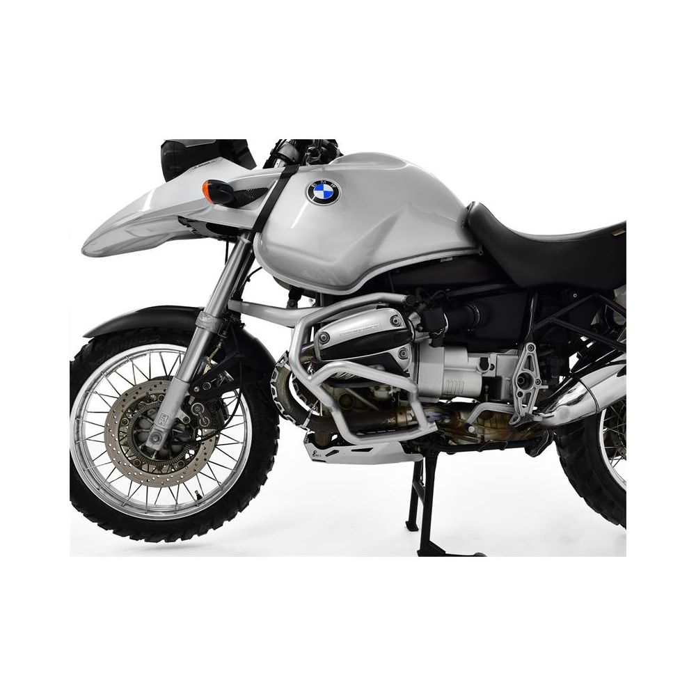Hõbedane roostevaba terasest kukkumisraam Ibex BMW R1150GS jaoks. Tänu nutikale konstruktsioonile kaitseb see mootorit kukkumise ajal ideaalselt.