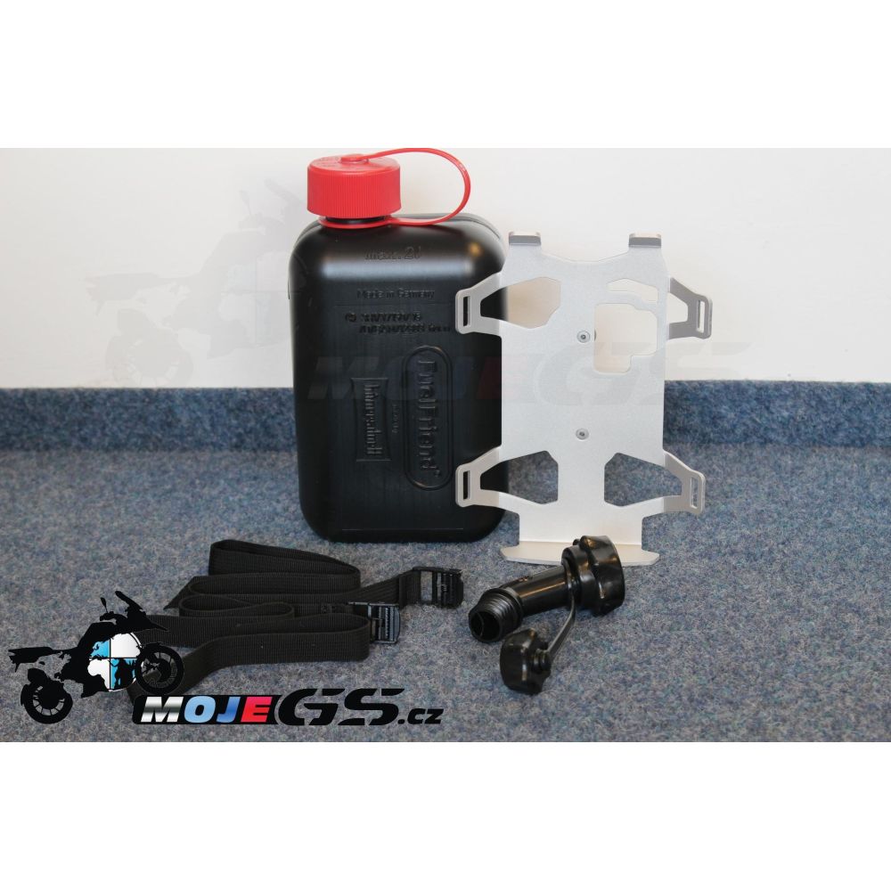 SW-Motech plastkanister, mille maht on 2 liitrit ja 3 cm laial korgil, et kütust vaevata juurde manustada. Pakendi sisaldab ka valamisnokka ja metallist hoidjat.