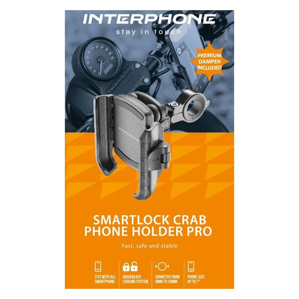 Yleismaailman Interphone Crab PRO -pidike mahdollistaa mobiililaitteen pitämisen käden ulottuvilla mukavasti ja turvallisesti moottoripyöräilyyn. Se yhdistää kestävästä alumiinista valmistetun rakenteen, tyylikkään muotoilun ja käytännöllisen toteutuksen edut. Pitimen puristimet ovat pehmustettu silikoonilla, ja ne kiinnittävät turvallisesti minkä tahansa mobiililaitteen, jonka leveys on 6 - 9 cm, ja parannetun integroidun tärinänvaimennusmoduulin ansiosta mobiililaite ei liiku edes suurimpien tärinöiden aikana. Interphone Crab PRO tärinänvaimennuksella sopii kaikkiin ohjaustankoihin, joiden halkaisija on 12 - 32 mm.