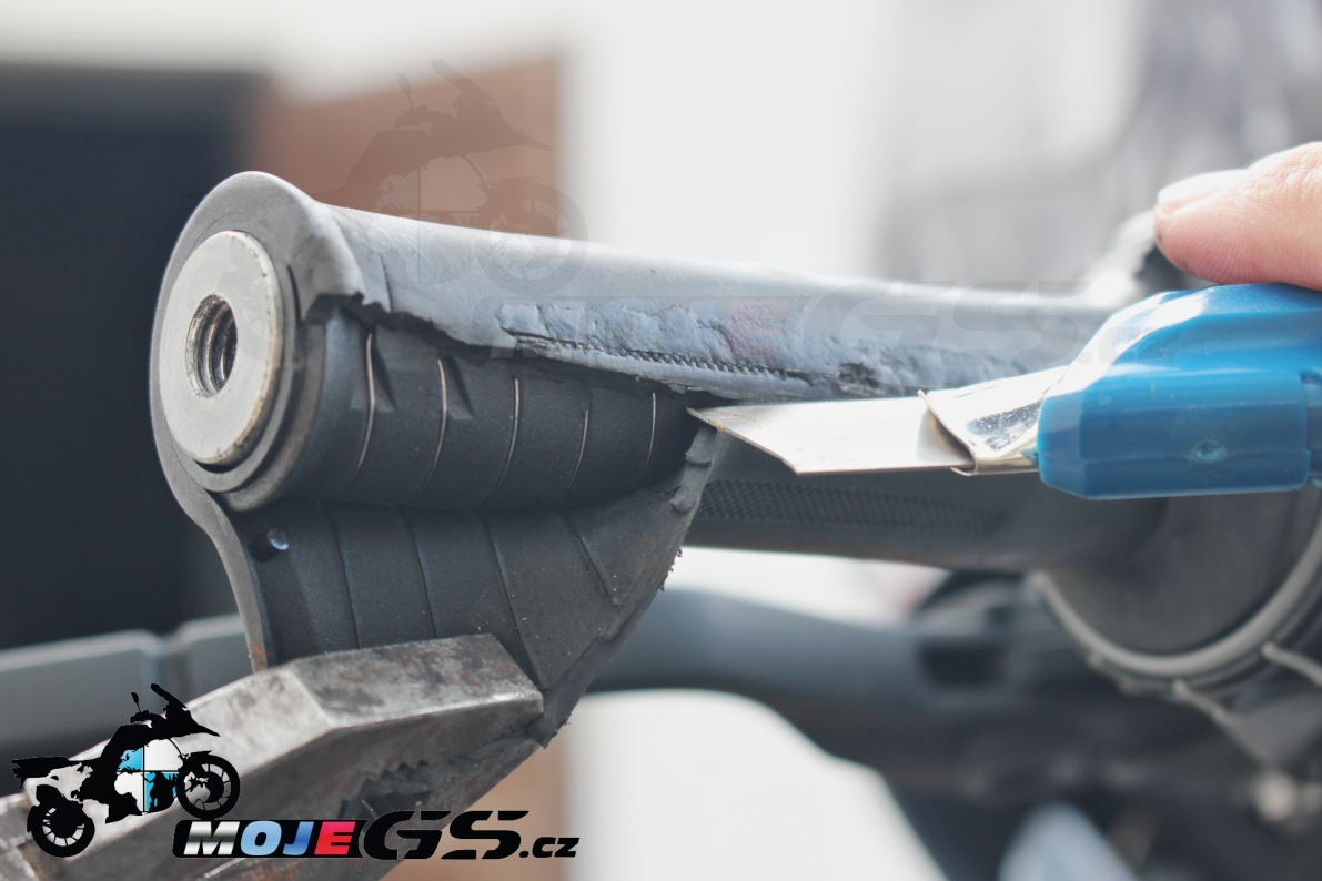 À l'aide d'une clé Torx, desserrez la vis qui maintient le blaster et le contrepoids. Incisez très prudemment la poignée en caoutchouc afin de ne pas endommager le fil chauffant. À l'aide de pinces, retirez lentement le caoutchouc collé tout en continuant à l'entamer au couteau. Nettoyez ensuite la poignée elle-même des restes de caoutchouc et installez-en une nouvelle. Il n'est pas nécessaire de la coller ; elle s'emboîte très serrée et tient sans tourner.