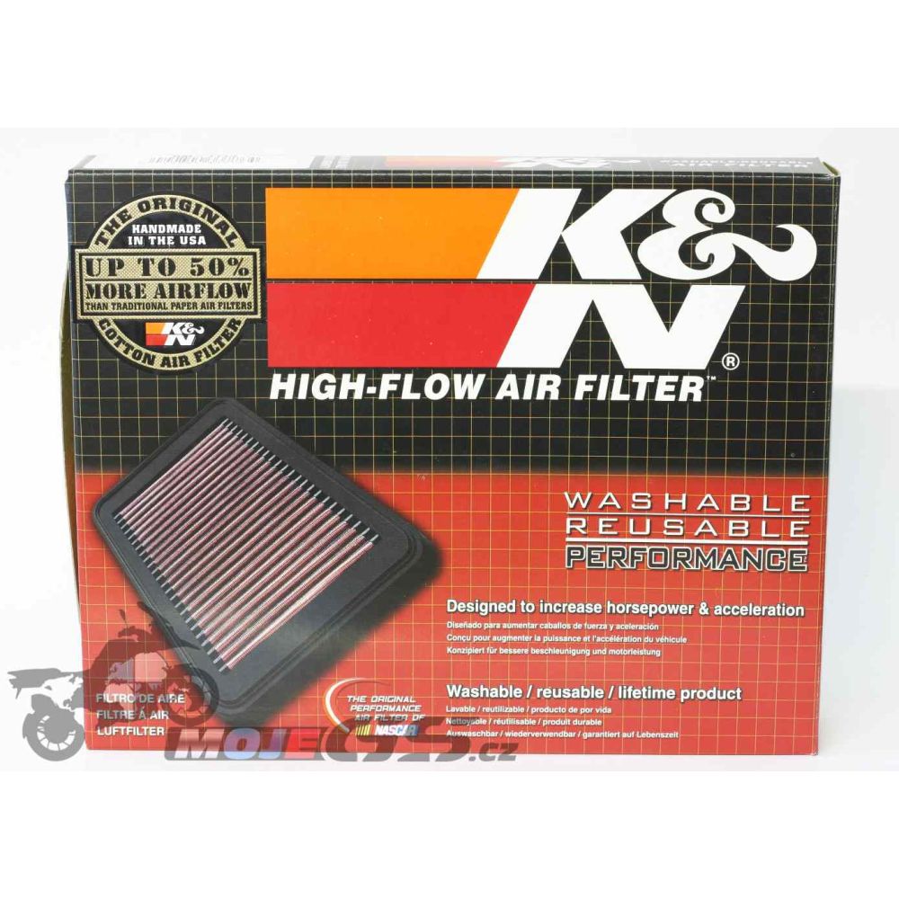 Zračni filtar K&N za air-box, zamjena za originalni papirnati ili sunđerasti filtar. Air-box nije potrebno nikako prilagođavati. Zahvaljujući patentiranoj tehnologiji, K&N filtri imaju veću propusnost zraka (za oko 40%), a istovremeno zadržavaju manje čestice prašine od originalnih filtera. Ovi filtri su perivi, stoga se ne moraju mijenjati. Tvrtka K&N daje jamstvo na funkcionalnost ovih filtara od 10 godina ili 1 milijun milja. Filtar je pri prvom korištenju već spreman od proizvođača.