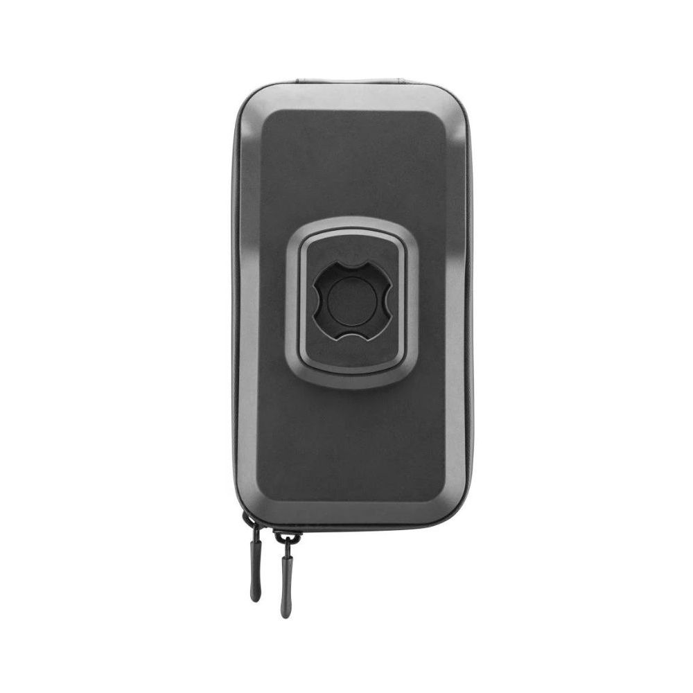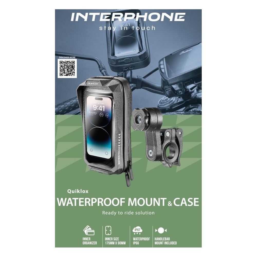 Ypač tvirta ir atspari vandeniui smartphone’ų dėklas iki 7" skirtas tvirtinimui motocikle ar dviračiu naudojant greito atjungimo sistemą Interphone QUIKLOX. Dėklas pagamintas iš kietos plastiko medžiagos, kuri užsidaro dviguba užtrauktuku, todėl keliaujant jis saugiai apsaugo nuo visų smūgių, dulkių, lietaus ir sniego. Dėl prieigos prie įkrovimo jungties apatinėje dėklo dalyje galite telefoną patogiai įkrauti keliaudami. Dėklo viršuje yra vieta mobiliajam telefonui iki 7 colių su kokybiška skaidria plėvele, kuri apsaugo ekraną ir leidžia naudotis visomis jutiklinio ekrano funkcijomis. Viduje dėklas turi vietą jūsų įrangai, atskirtą kišenėmis, kad geriau organizuotumėte daiktus. Taip turėsite, pavyzdžiui, raktus ar piniginę visada po ranka. Pakuotėje yra Interphone QUIKLOX laikiklis su greito atjungimo sistema, leidžianti jums visada turėti savo mobilųjį telefoną su savimi. Tai universali laikiklis, tinkamas vamzdiniams vairams, kuris prisitaiko prie įvairaus skersmens. Prilietus laikiklį, dėklą paprastai pasukate ir jis tvirtai pritvirtinamas. Taip pat greitai po važiavimo galite nuimti dėklą. Laikiklio kampą galite reguliuoti pagal poreikį.